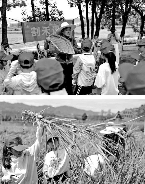 研學中,孩子們在專業老師指導下小心翼翼割下稻穗,并利用傳統農具禾斛脫粒,近距離感受千年稻作文化的鮮活氣息。
