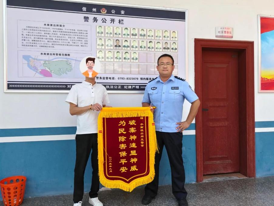 9月6日,為表達對水南派出所民警高效辦案效率和熱情服務態度的感激之情,陳先生特意制作了一面寫有“破案神速顯神威,為民除害保平安”的錦旗,送至水南派出所?!澳銈冞@辦案效率太快了!真的太感謝你們了,幫我及時追回了財物?!标愊壬罩窬氖郑拥卣f道。