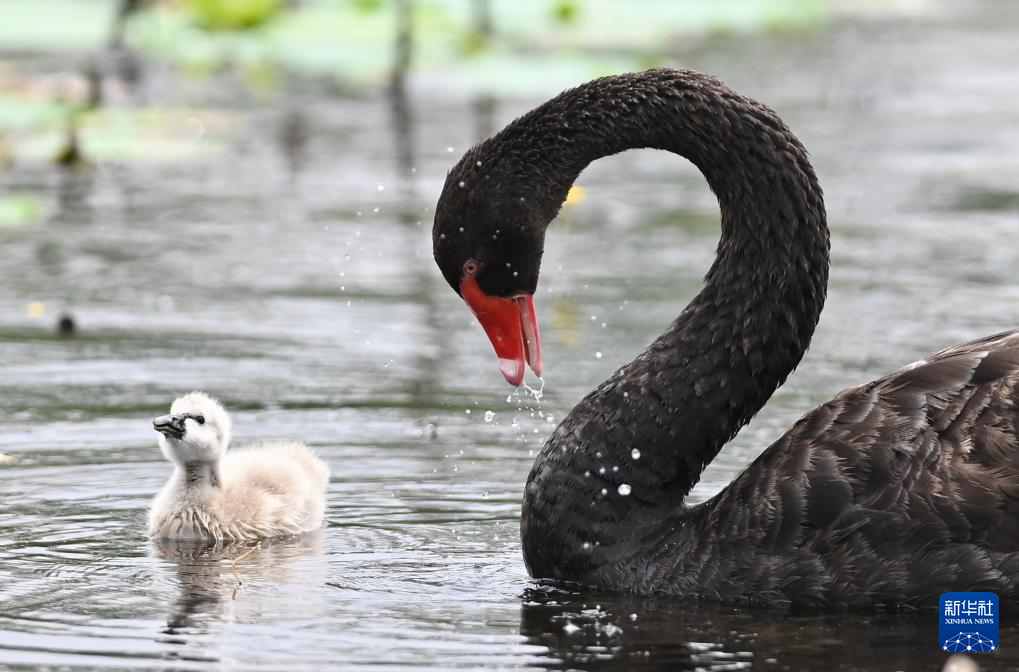 近日,在山東滕州微山湖紅荷濕地景區,一對黑天鵝夫婦喜添新丁,自然繁殖的五只天鵝寶寶緊隨親鳥在水中游弋覓食。